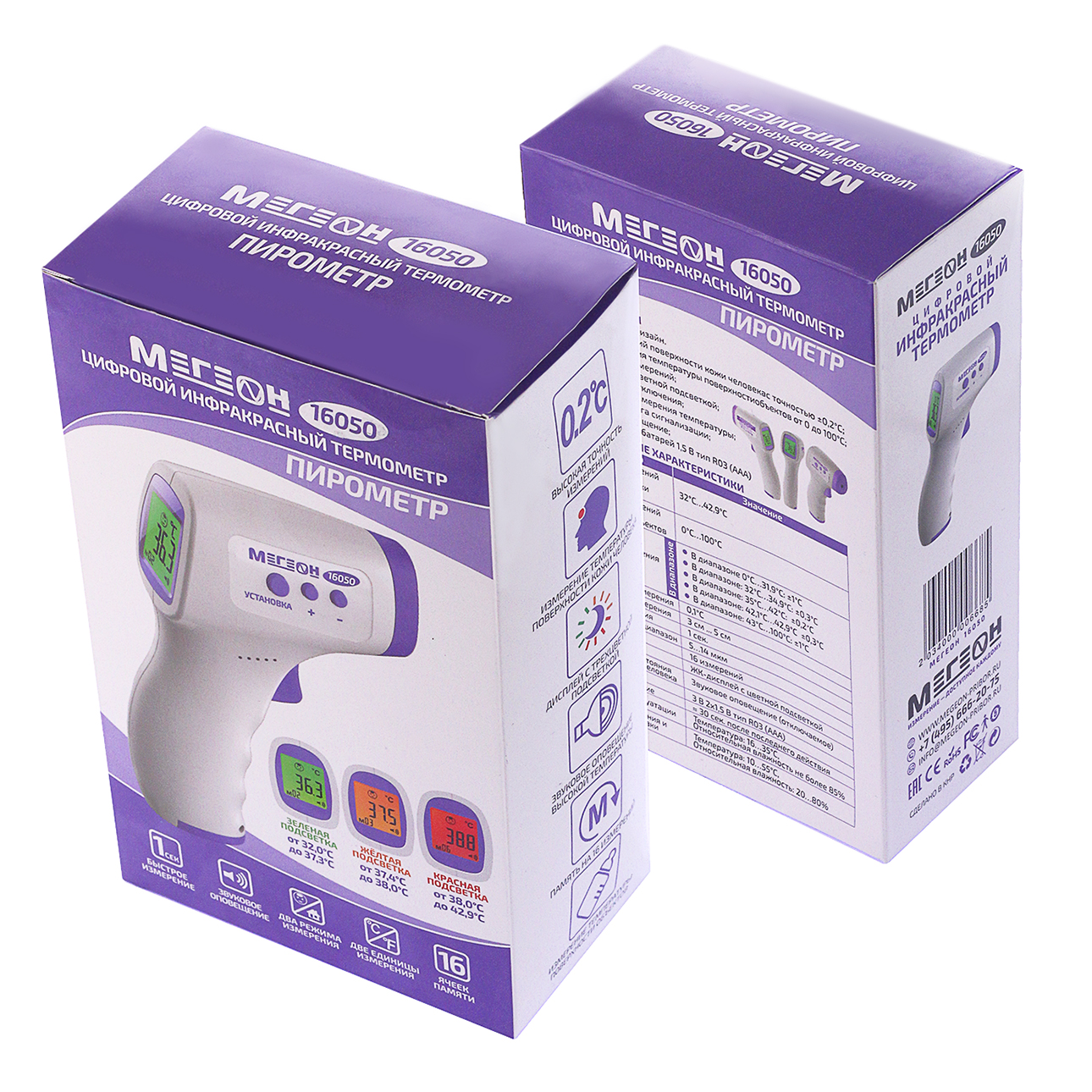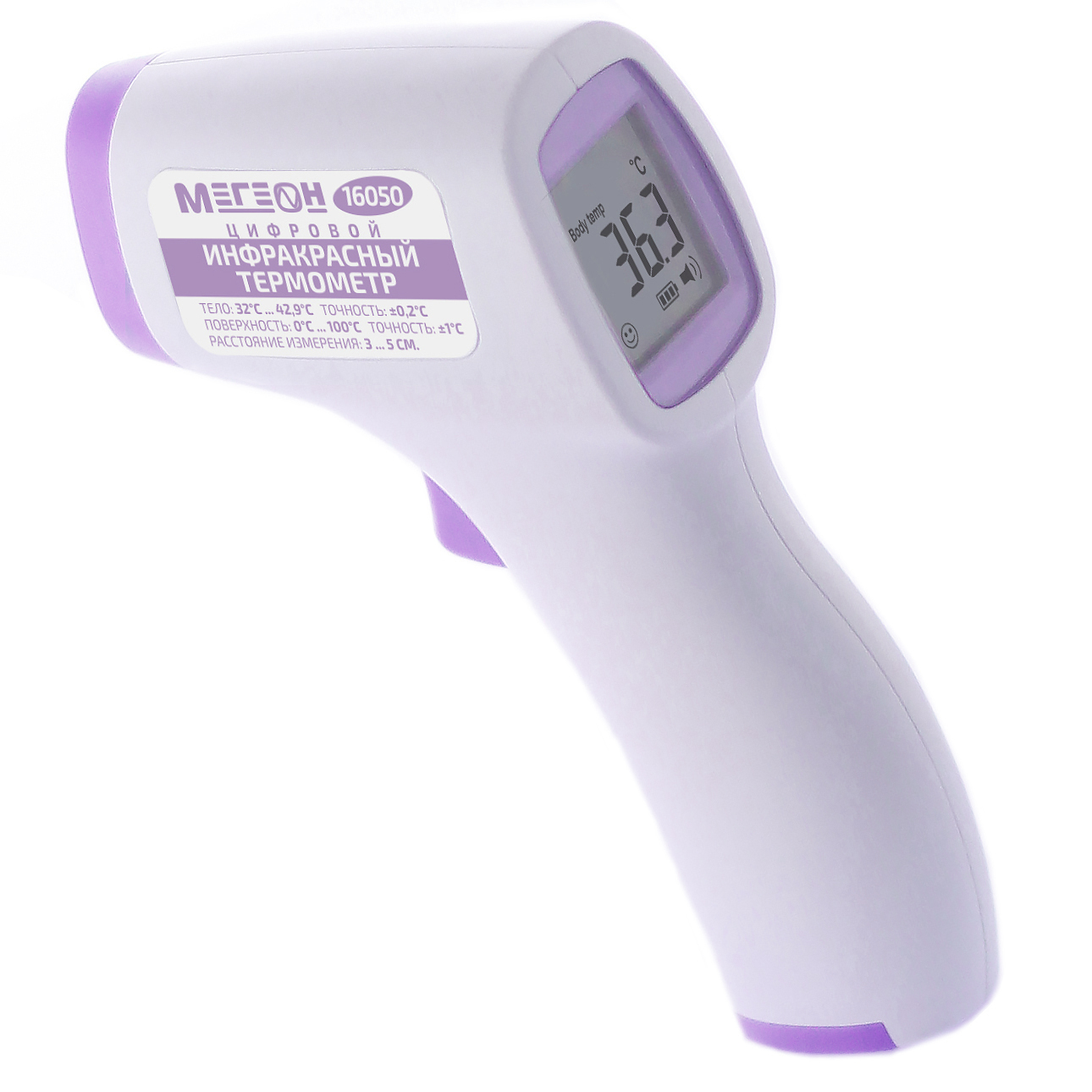 МЕГЕОН 16050 - бесконтактный термометр (градусник), который предназначен для работы в бытовых условиях. Термометр имеет возможность выполнять с высокой точностью измерения температуры поверхности кожи человека в диапазоне от 32°С до 42,9°С и продуктов питания и воды в диапазоне от 0 до 100°С. Прибор имеет функцию звуковой сигнализации превышения температуры с возможностью изменения порога звуковой сигнализации. Термометр также имеет встроенную память на 32 измерения. Также термометр оснащён функцией автоматического отключения, что в свою очередь значительно экономит заряд батарей. Прибор имеет встроенный датчик температуры корпуса, что позволяет значительно повысить точность и стабильность измерений. Функциональные возможности позволяют проводить корректировку поправочного значения смещения. Для работы при плохом освещении предусмотрена подсветка дисплея. Простота настройки и эксплуатации не потребует какой-либо технической подготовки.Таким образом бесконтактный инфракрасный термометр (пирометр) МЕГЕОН 16050 станет незаменимым помощником в быту и значительно упрости измерение температуры детей.